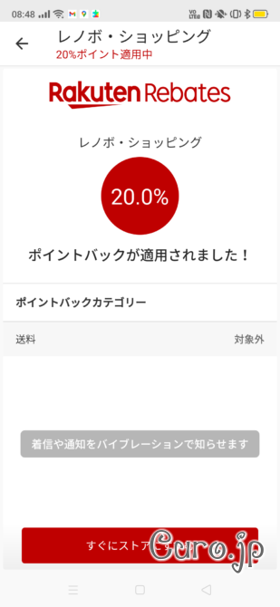 楽天リーベイツのアプリだと、購入中でも『20%ポイント適用中』と表示が出るので分かりやすいです。