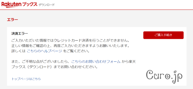 レビューを見ていると、何度かカードがエラーで使えないと、楽天ブックス側でカードがブロックされてしまうそうですね。その場合は楽天ブックスのサポートへ問い合わせると、ロックを解除してくれるらしいです。
