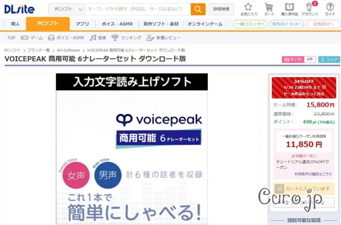 DLsiteの『VOICEPEAK 商用可能 6ナレーターセット』の値段は公式サイトと同じ15,800円(期間限定価格)ですが、さらにDLsiteのクーポンを使うことができます。