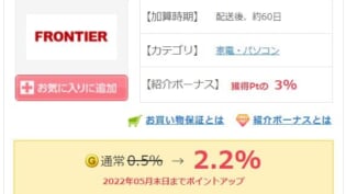 最初に結論まとめておくと、『GetMoney!』に登録・経由して(リンク踏んで)からフロンティアで買い物をすると2.2%の還元があります。(2022/3/22時...